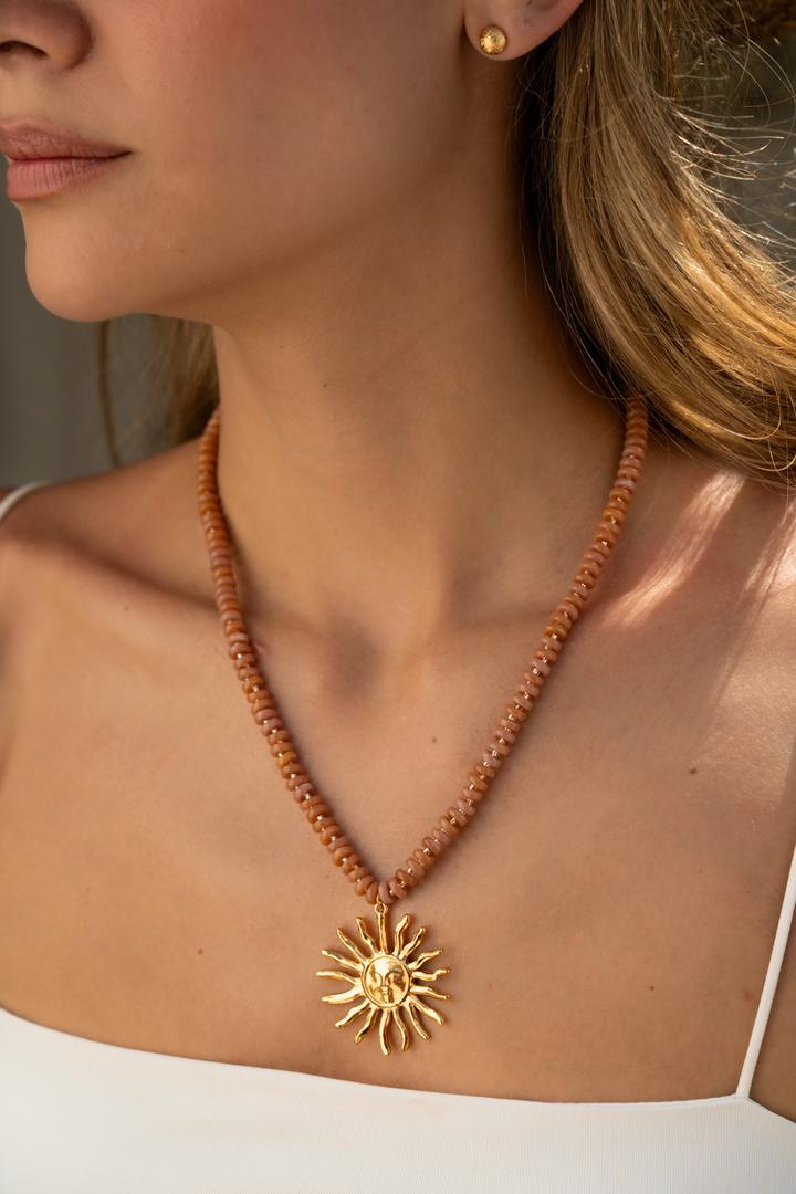 Siente la fuerza del sol en una pieza diseñada para destacar. Nuestro collar Maxi Sol Gold es una declaración de estilo artesanal, capturando un brillo excepcional gracias a su baño de oro de 24k sobre una base de bronce y dijes de alta calidad.